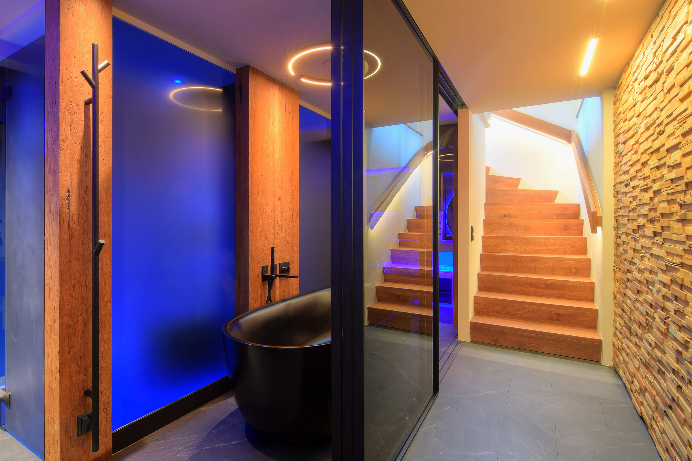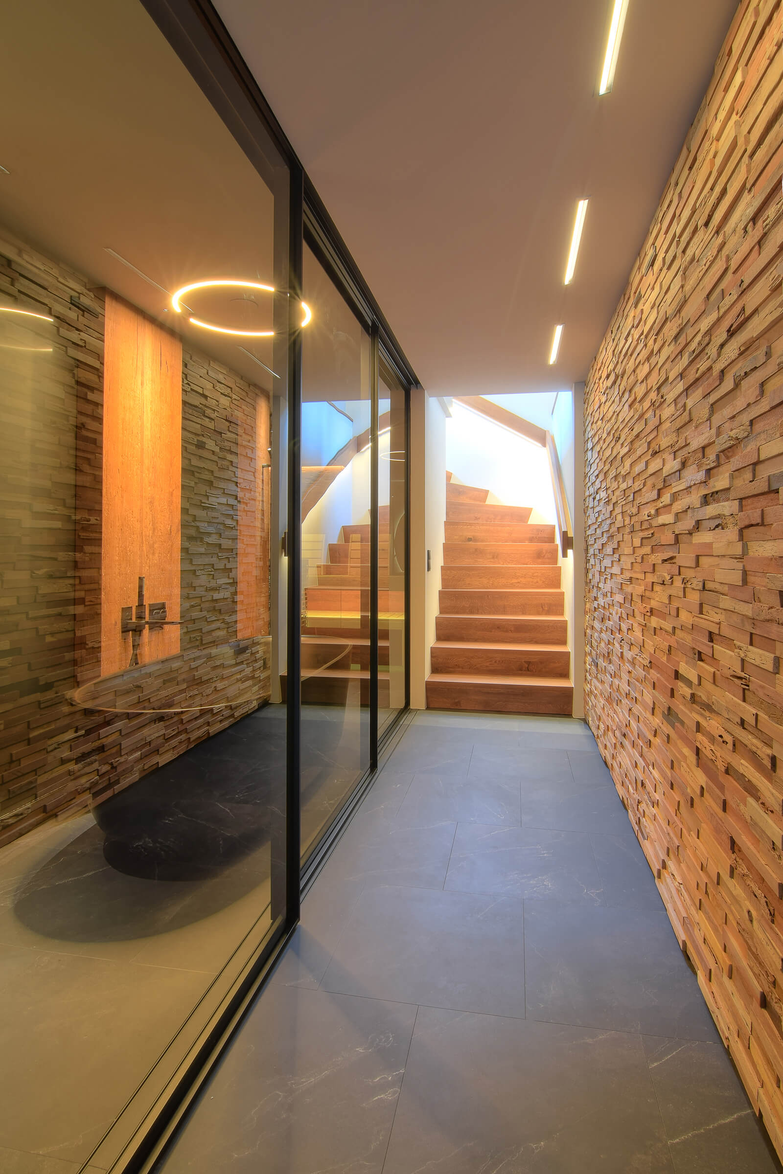 Um das Badezimmer sowohl optisch zu vergrößern als auch von beiden Seiten zugänglich zu machen, fiel die Wahl auf eine elegante Schiebetüranlage von Raumplus. Die Glastüren mit matt schwarzem Rahmen integrieren sich perfekt in die moderne, cleane Gestaltung des gesamten Raumes und verstärken den Loft-Charakter. Diese Lösung schafft nicht nur mehr Raumgefühl, sondern setzt einen stilvollen Akzent im Gesamtbild der Einrichtung.