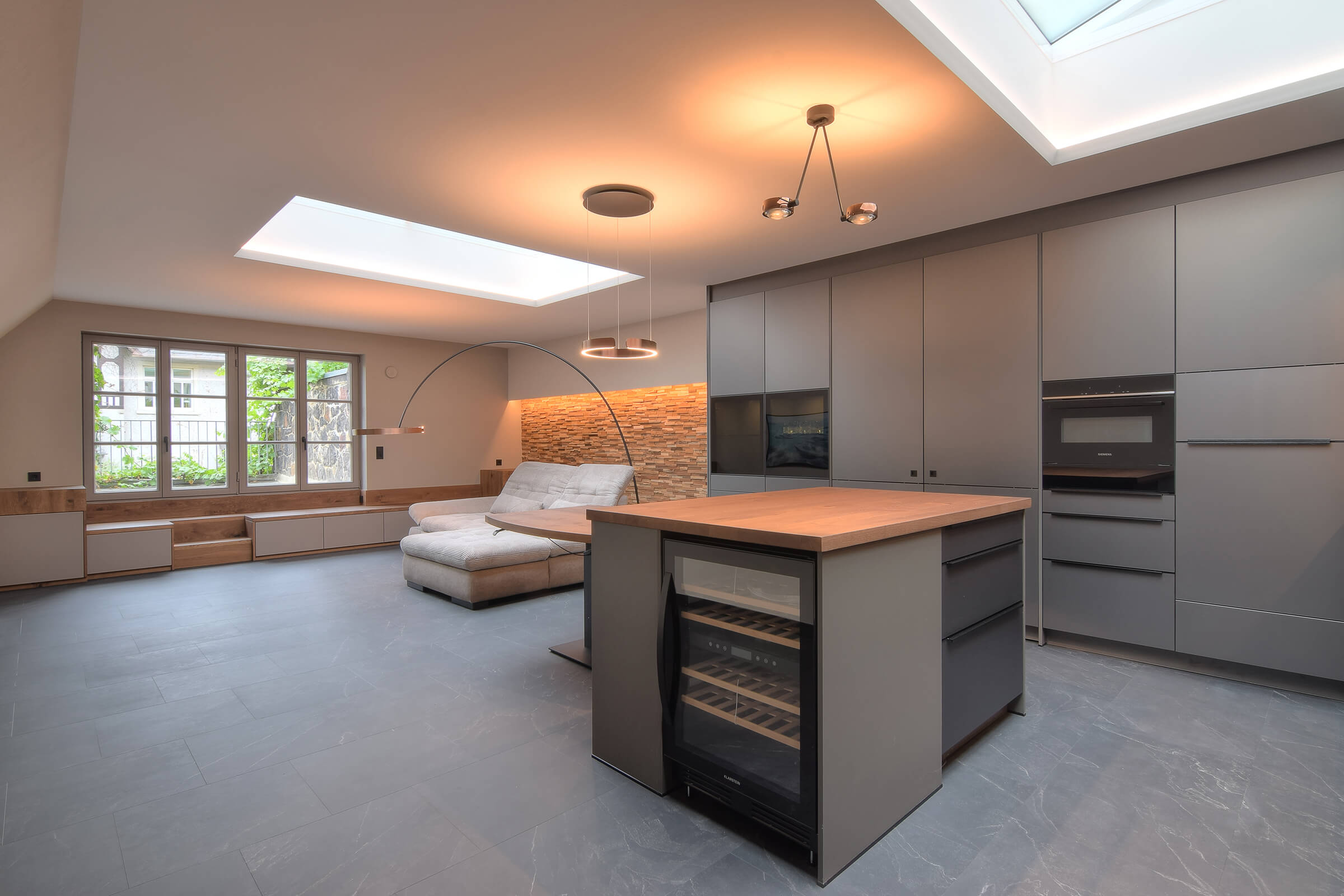 Für die perfekte Ausleuchtung der Küche und des Wohnbereichs haben wir die hochwertigen Occhio-Leuchten ausgewählt. Diese bieten nicht nur funktionales Licht, sondern setzen auch stilvolle Akzente in der modernen Einrichtung. Die Leuchten können verschiedene Lichtstimmungen erzeugen – von warmem, indirektem Licht für eine gemütliche Atmosphäre bis hin zu hellem, kühlem Licht, das beim Kochen für eine klare Sicht sorgt. So entsteht ein harmonisches Zusammenspiel von Funktionalität und Design.